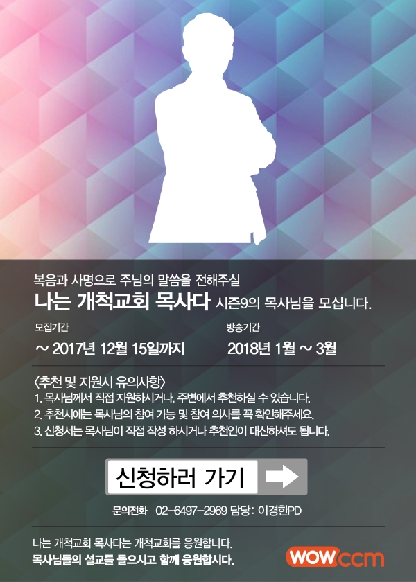 1. 먼저 목사님 본인의 참여 가능 및 참여 의사가 있는지 확인 후 추천해 주시기 바랍니다. 2. 추천 목사님과 추천하시는 분의 연락처/ 이메일 / 소속 교회를 작성해 주십시오. 3. 게시판 글쓰기 (http://wowccm.net/bbs/write.php?bo_table=w_pastor) 로 작성하여 주시면 됩니다. 4. 자세한 문의는 02-6479-2969 (담당 이경한 PD) * 신청/추천은 17년 12월 15일까지이며, 선정되신 목사님께는 추후 개별연락드립니다. |